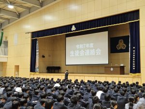 生徒会が去年行ってきた活動報告や振り返りと専門委員会の委員長の挨拶が前半であり、最後に新生徒会の目標や今後の活動内容についての話がありました。