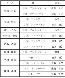 9月20日(土)に行われた福岡バトントワーリング選手権大会の結果以下の通りです。
